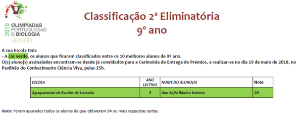 É com muito gosto que o Agrupamento volta a parabenizar a Ana Sofia Valente (do 9E) porque, desta feita, está premiada nas Olimpíadas da Biologia (categoria Júnior), ao ter ficado nos 10 melhores classficados a nível nacional. A cerimónia de reconhecimento de agraciação dos melhores concorrentes é já no dia 19-maio, pelas 15h, no Pav. do Conhecimento. Segundo a Ordem Portuguesa dos Biólogos, a lista completa dos vencedores (os 10 melhores classificados de 9º ano), apenas será revelada após a cerimónia de entrega dos prémios no dia 19 de maio.