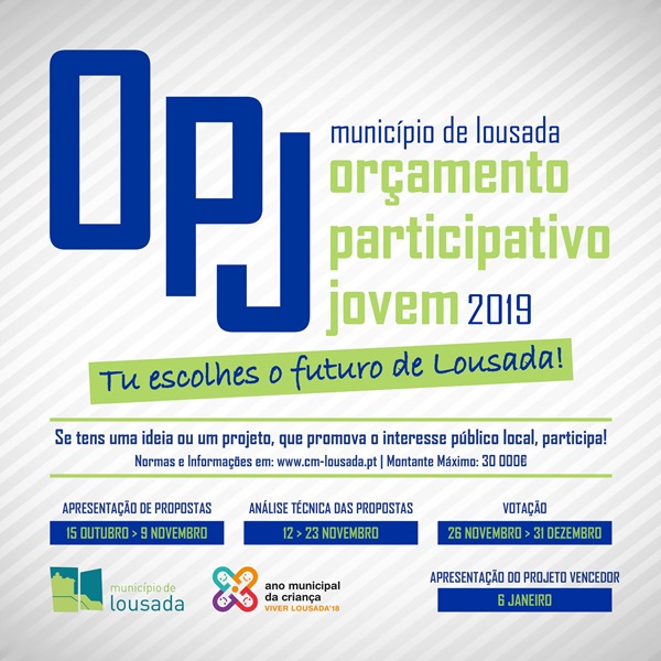 Por solicitação da Autarquia reforça-se a divulgação da iniciativa Orçamento Participativo Jovem 2019 (OPJ), desafiando os nossos alunos a apresentarem as suas ideias, no sentido de as poderem ver concretizadas localmente, através de financiamento próprio, oriundo do Orçamento Municipal.