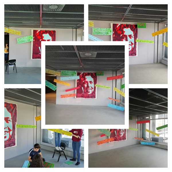 A turma H do 10ºano criou, a propósito das comemorações dos 70 anos dos direitos humanos e dos 40 anos da integração de Portugal na ONU, uma instalação com a figura central da Eleanor Roosevelt e algumas das suas citações que foram atravessando os anos e nunca deixando de estar atuais. A turma optou por deixar algumas tiras de cartão em branco para também tu poderes deixar as tuas ideias a propósito do tema. Colabora!!!! Entrega as tuas ideias junto da turma 10H e faz parte deste movimento expressivo.