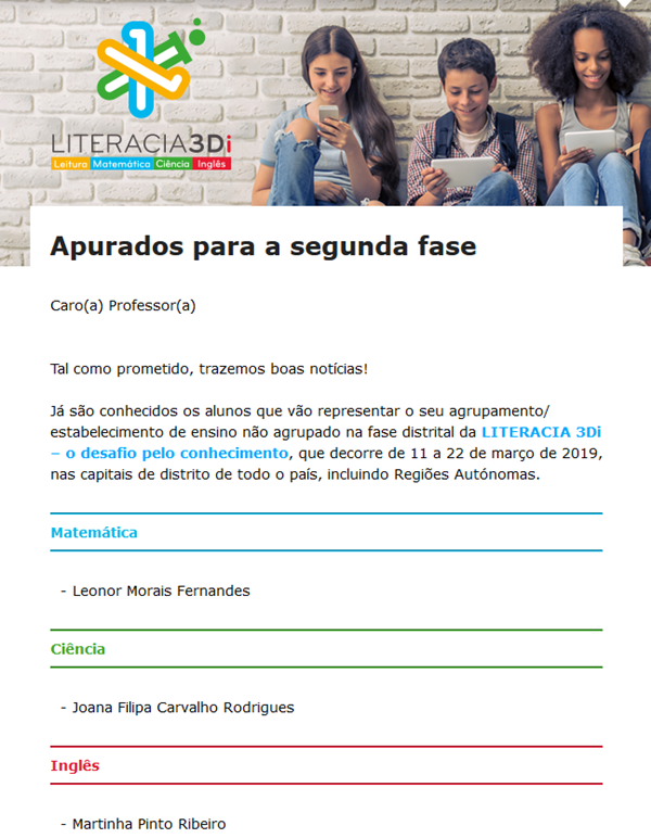 Parabéns à Leonor Fernandes, à Joana Rodrigues e à Martinha Ribeiro, pelo apuramento para a 2ª Fase. A Porto Editora já notificou diretamente os alunos e disponibiliza-se aqui alguma informação de detalhe que foi comunicada à Escola.