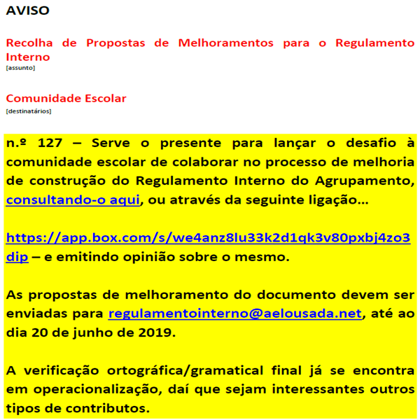 Decorre até 20 de junho o processo de recolha de contributos para melhoramento do Regulamento Interno. Quem estiver interessado em participardeve consultar o documento provisório aqui e endereçar os seus contributos para Este endereço de email está protegido contra piratas. Necessita ativar o JavaScript para o visualizar., até 20 de junho. Uma vez que se trata de um processo de participação democrática, aberto à comunidade, conta-se com a máxima mobilização de tod@s.