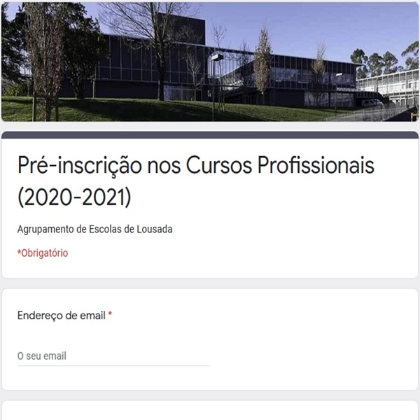 Disponibiliza-se aqui um formulário destinado a alunos (internos e externos) que pretendam (re)manifestar o seu interesse em vir a integrar um Curso Profissional em 2020/2021. Esta manifestação de intenção não substitui a formalidade da matrícula nem a formalidade de entrevista mas permite à Escola ir organizando, entre outros, o processo de seleção de candidatos por entrevista.