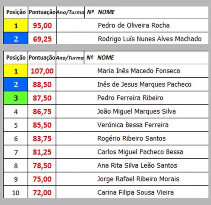 Salientam-se os bons resultados obtidos, tendo como melhores classificados os alunos apresentados na tabela à direita:
