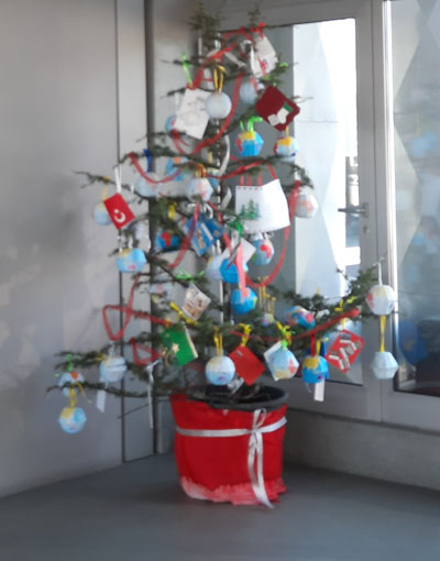 A árvore de Natal está decorada com Globos de Papel, com o uso de uma projeção cartográfica azimutal, e com postais de Natal alusivos a diferentes países do mundo.