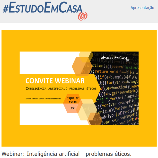 Webinar: Inteligência artificial - problemas éticos | No próximo dia 03-fev., as alunas Ana Sofia e Ana Sousa vão participar num webinar, organizado pela equipa do Projeto "#EstudoEmCasa@". Este evento enquadra-se no ciclo reflexivo da disciplina de Filosofia (orientada pela Prof. Cândida Novais) indexado ao domínio curricular "Problemas do Mundo Contemporâneo - Questões éticas da Inteligência Artificial" e decorre de convite inicial que nos foi dirigido, com o propósito de uma nova abordagem das práticas pedagógicas em contexto virtual e interativo, com alunos de todo o país e dos países da comunidade Palop.