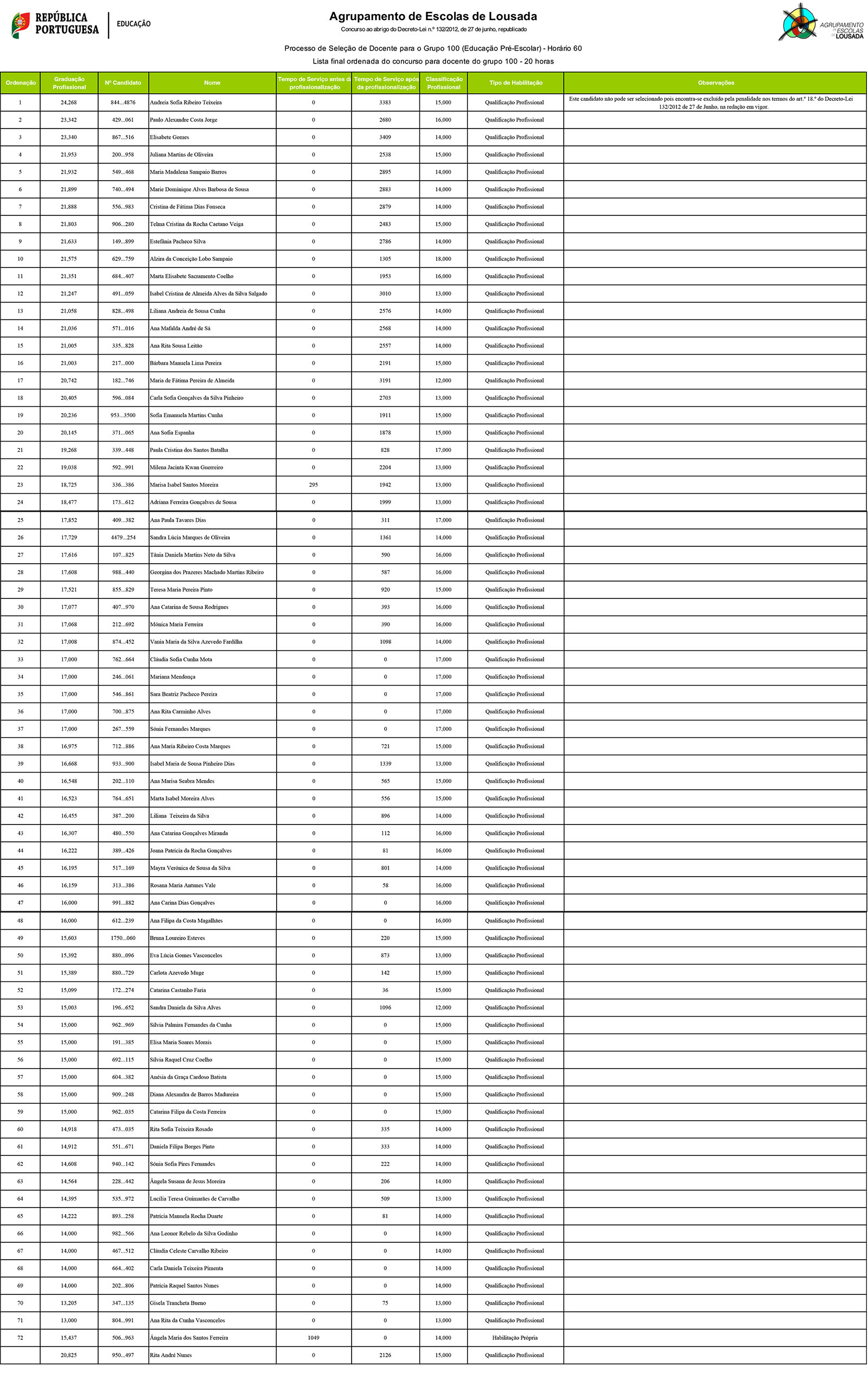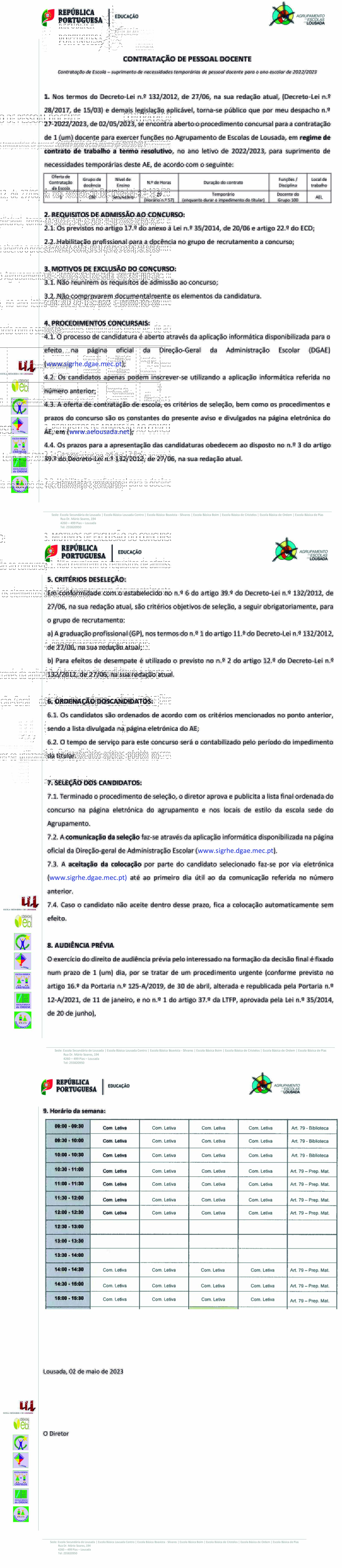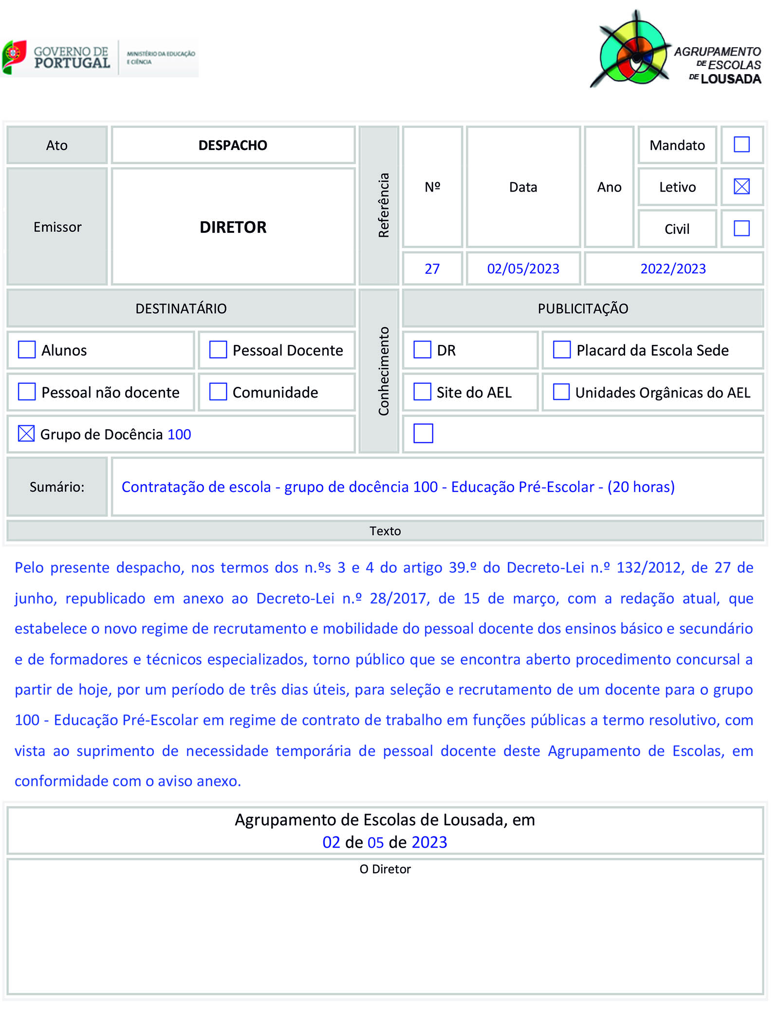 Contratação de escola - grupo de docência 100 - Educação Pré-Escolar