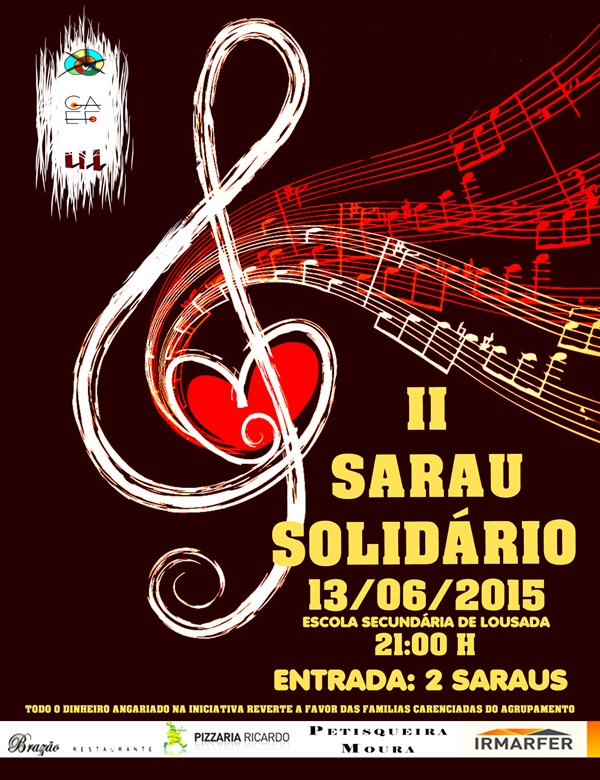 No dia 13 de junho vai decorre a IIª edição do Sarau Solidário do GAEF. Esta iniciativa, para além de pretender ser cultural e mostrar o talento dos jovens do nosso agrupamento, procura ser um momento de recolha de fundos para o GAEF poder, ao longo do ano - como fez no decorrer deste - acudir a famílias com dificuldades, comprando alimentos/cabazes, para além da época de Natal. Desta forma, estão desde já todos convidados a comprarem o vosso bilhete (que, com base num sorteio, poderá dar origem a prémios "saborosos") e a divulgar a iniciativa e os objetivos da mesma. Os cartazes (da autoria do Miguel, 10ºMM) já andam por aí! Qualquer informação adicional ou esclarecimento, procurem a equipa do GAEF!