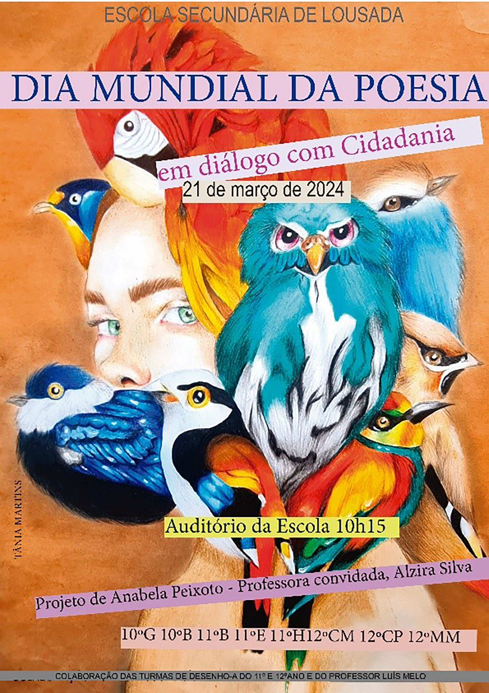 Nas palavras de Johann Goethe, “Todos os dias devíamos ouvir um pouco de música, ler uma boa poesia, ver um quadro bonito e, se possível, dizer algumas palavras sensatas” – neste projeto, junta-se ao nosso “dizer Poesia”, a música, a pintura, o desenho, num trabalho colaborativo coordenado pela professora Anabela Peixoto e com a colaboração especial da professora convidada, Alzira Silva, a participação do professor Luís Melo e da professora Cristina Pacheco, do ex-aluno Afonso Pires, da aluna que ilustrou o cartaz, Tânia Martins, do aluno Simão Ferreira, dos alunos dos ensinos geral e profissional (10ºB, 10ºG, 11ºB, 11ºE, 11ºH, 11ºJ, 12ºCM, 12ºCP, 12ºMM, 12ºI) – um projeto inclusivo, destinado a toda a comunidade educativa.