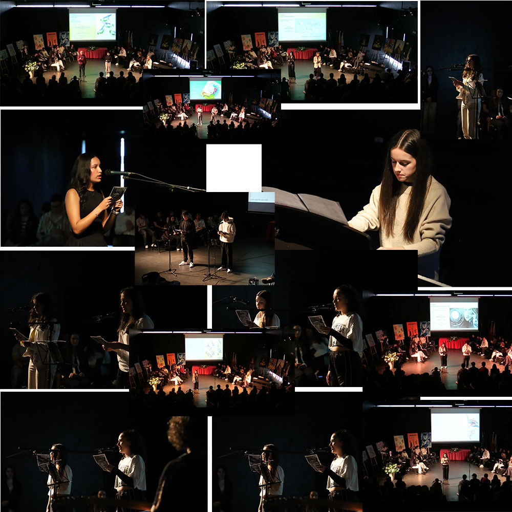O espetáculo, desenvolvido pelo 3º ano consecutivo no âmbito do Projeto “Dia Mundial da Poesia em diálogo com Cidadania”, foi apresentado no dia 21 de março, no auditório da nossa Escola, à comunidade escolar, sendo uma homenagem aos poetas, à Poesia, à Arte, materializado no diálogo expressivo e emotivo com o Belo que há na arte poética, na música, na dramatização, na dança, nas artes plásticas.