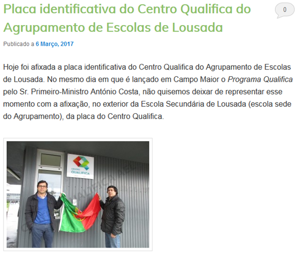 6-mar. - No âmbito do lançamento nacional do Programa Qualifica, o Centro Qualifica do nosso Agrupamento assinalou localmente a iniciativa com a afixação de uma placa alusiva ao eixo de intervenção. O ato público simbólico ficou a cargo do Sr. Diretor do Agrupamento e do Coord. do Centro Qualifica do Agrupamento.