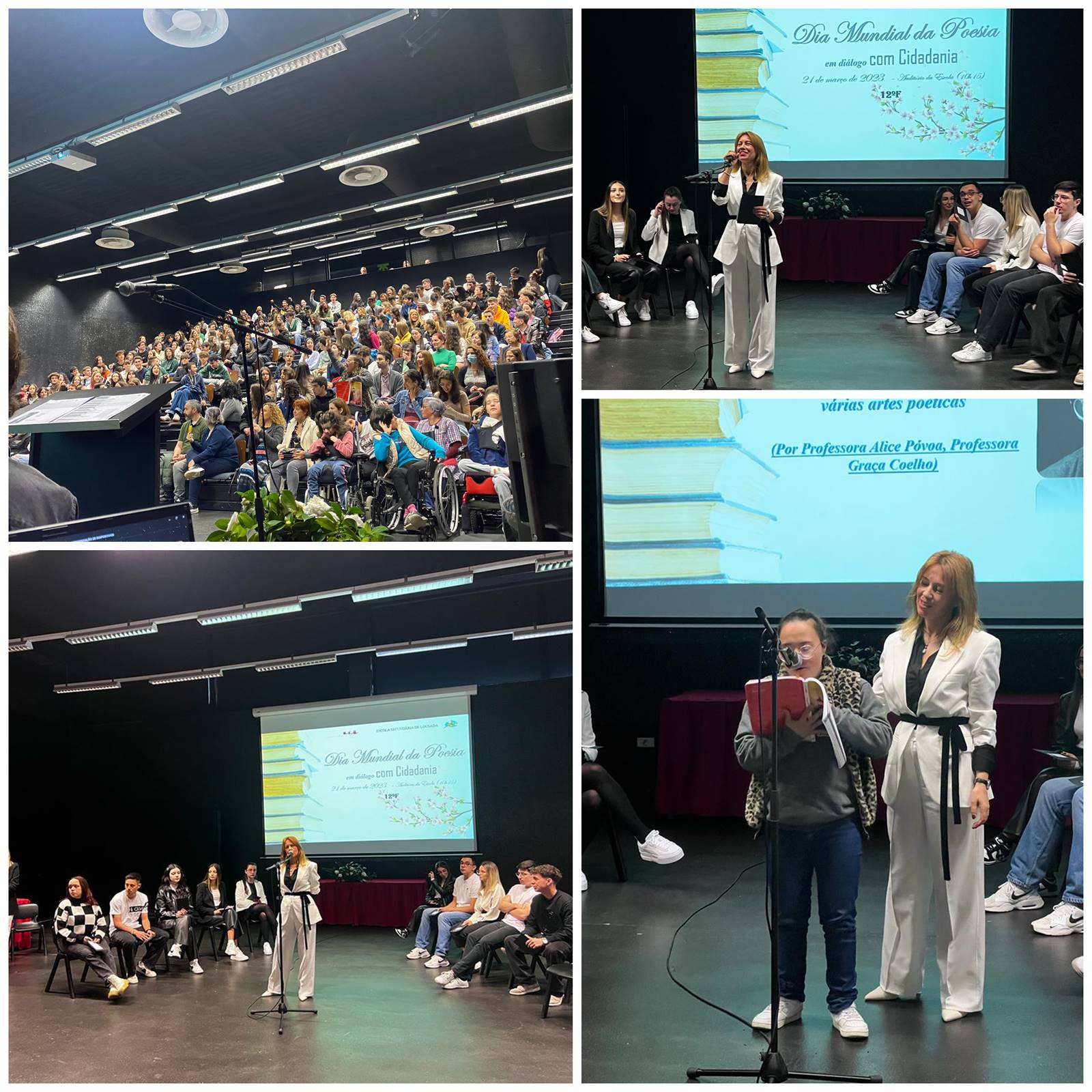 21 de março – “Dia Mundial da Poesia” – levou ao Auditório da Escola Secundária um público que se elevou pela sua diversidade e postura. Constituído maioritariamente por alunos do ensino secundário, regular e profissional, e professores, contou ainda com a presença dos alunos e equipa do Ensino Especial, bem como de encarregados de educação da turma do 12ºF, que apresentou e organizou a atividade, sob a direção da professora de Português e Diretora de Turma.