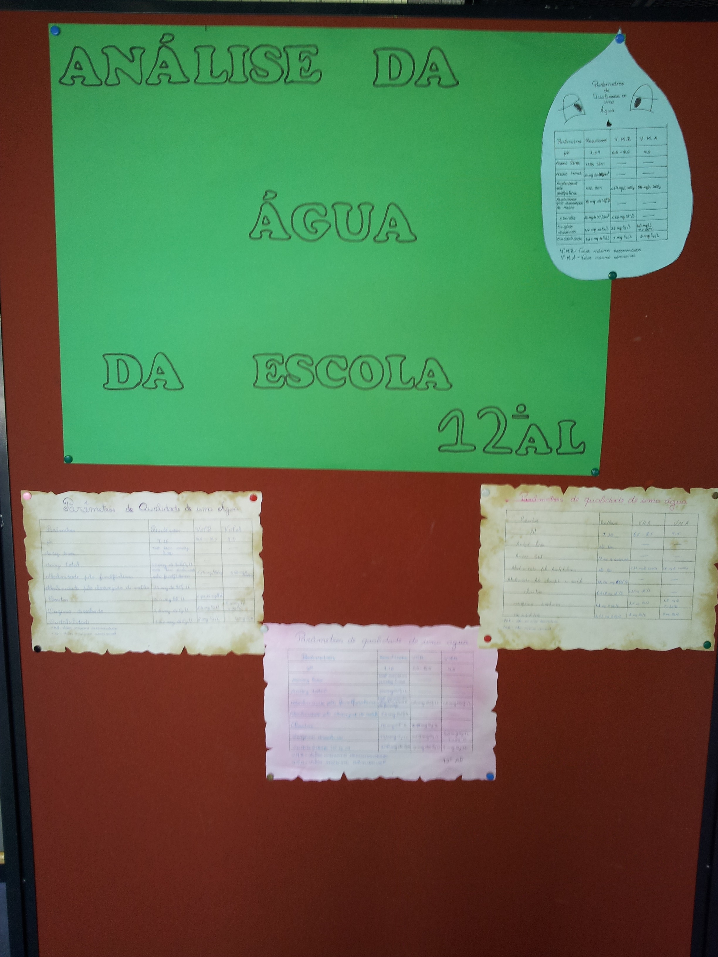 No âmbito do Curso Profissional de Análises Laboratoriais e na disciplina de Análises Químicas, o 12AL, sob orientação da Prof. Sónia Sampaio, realizou um trabalho dedicado à análise da composição química da água da Escola. Os resultados das análises podem ser consultados no átrio da entrada-ESL.