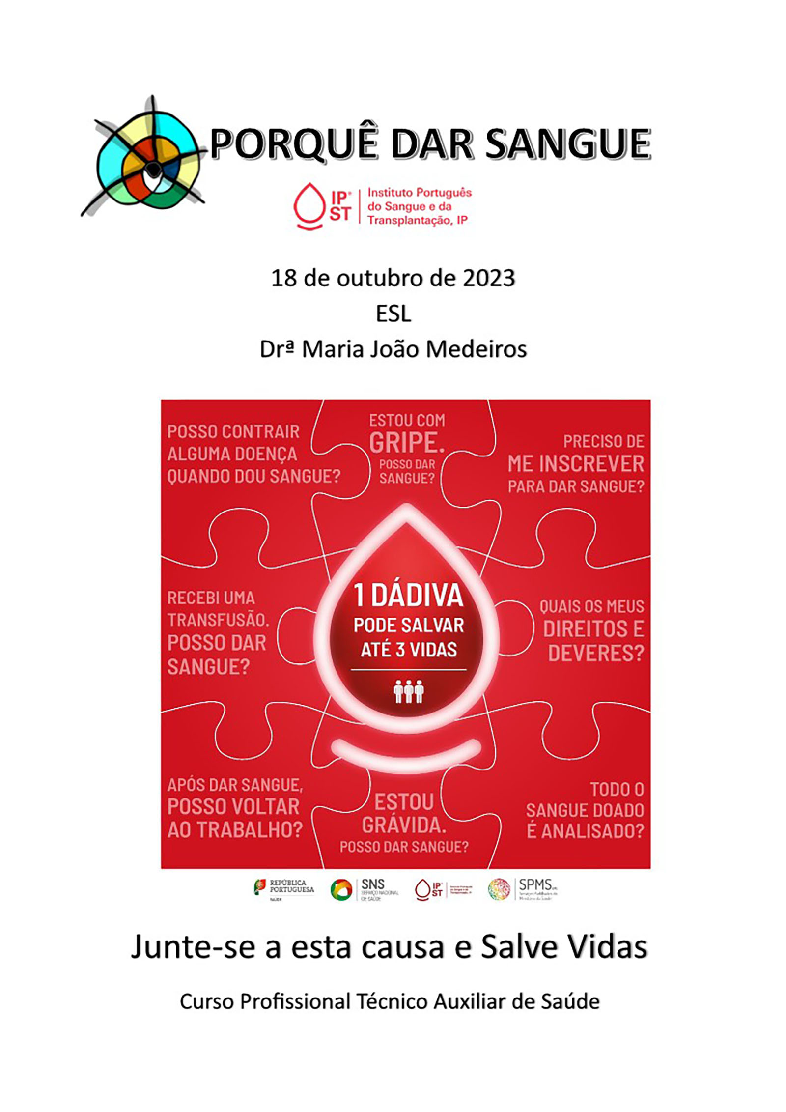 No dia 18 de outubro, pelas 10h15 da manhã, a turma do 12ºADS recebeu a Drª Maria João Medeiros, do Instituto Português de Sangue e Transplantação (https://ipst.pt/index.php/pt/