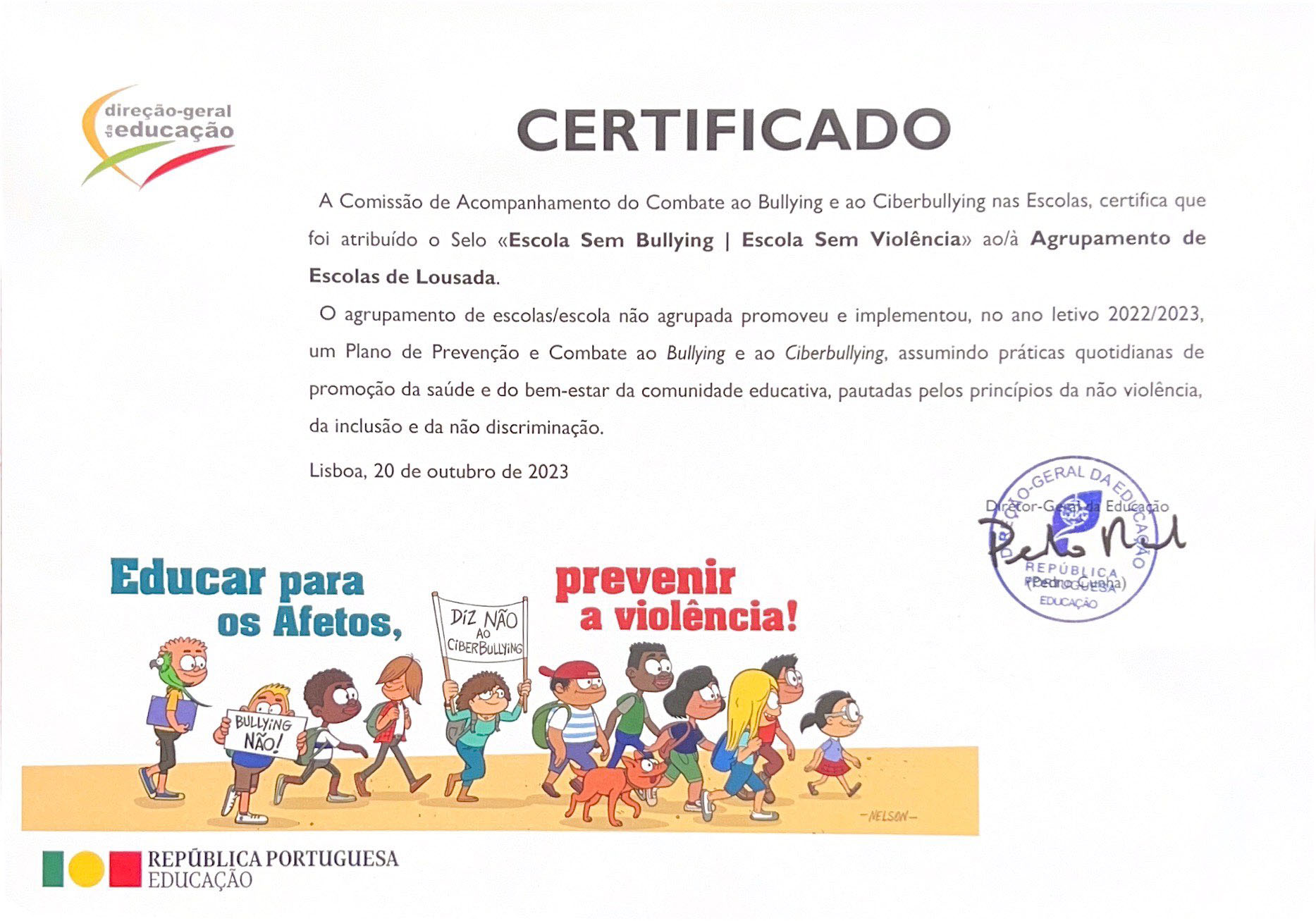 Foi atribuído ao Agrupamento de Escolas de Lousada o Selo “Escola sem Bullying / Escola sem Violência” pela Comissão de Acompanhamento do Combate ao Bullying e ao Cyberbullying nas Escolas.