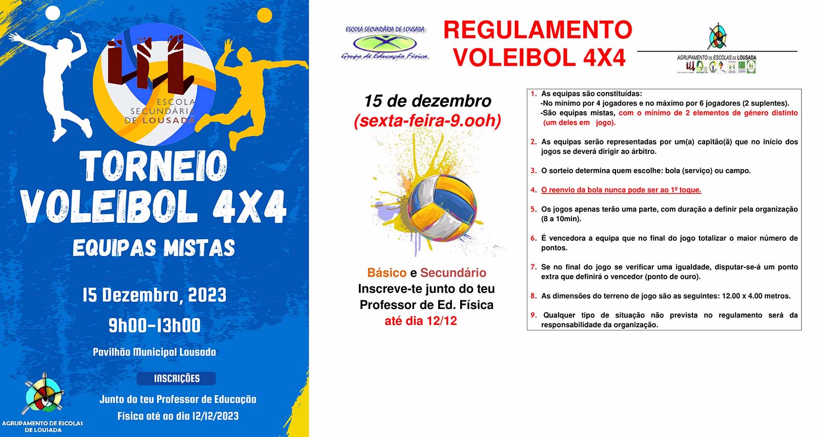 Componha a sua equipa com 6 jogadores, sendo 2 obrigatoriamente do género distinto, solicite a ficha de inscrição junto do professor de Educação Física e entregue a mesma devidamente preenchida impreterivelmente até ao dia 12 de dezembro de 2023.