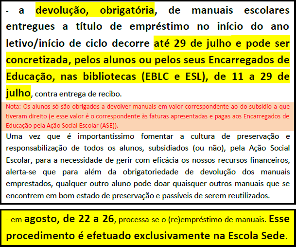 Disponibilizam-se aqui informações úteis sobre o assunto em causa, designadamente sobre prazos e termos a cumprir. Para além disso, no âmbito do estabelecido no nº. 5, do art. 10º, do Despacho n.º 8452-A/2015, publicado no Diário da República, 2.ª série — N.º 148 — 31 de julho de 2015, informamos que no caso dos alunos que completaram o 12.º ano ou que optem pela transferência para cursos do ensino privado, a falta de restituição dos respetivos manuais nas devidas condições implica a não emissão de certificados de habilitações ou diplomas de conclusão de ciclo, até que se verifique a restituição dos referidos manuais em bom estado de conservação, ou à respetiva compensação pecuniária.