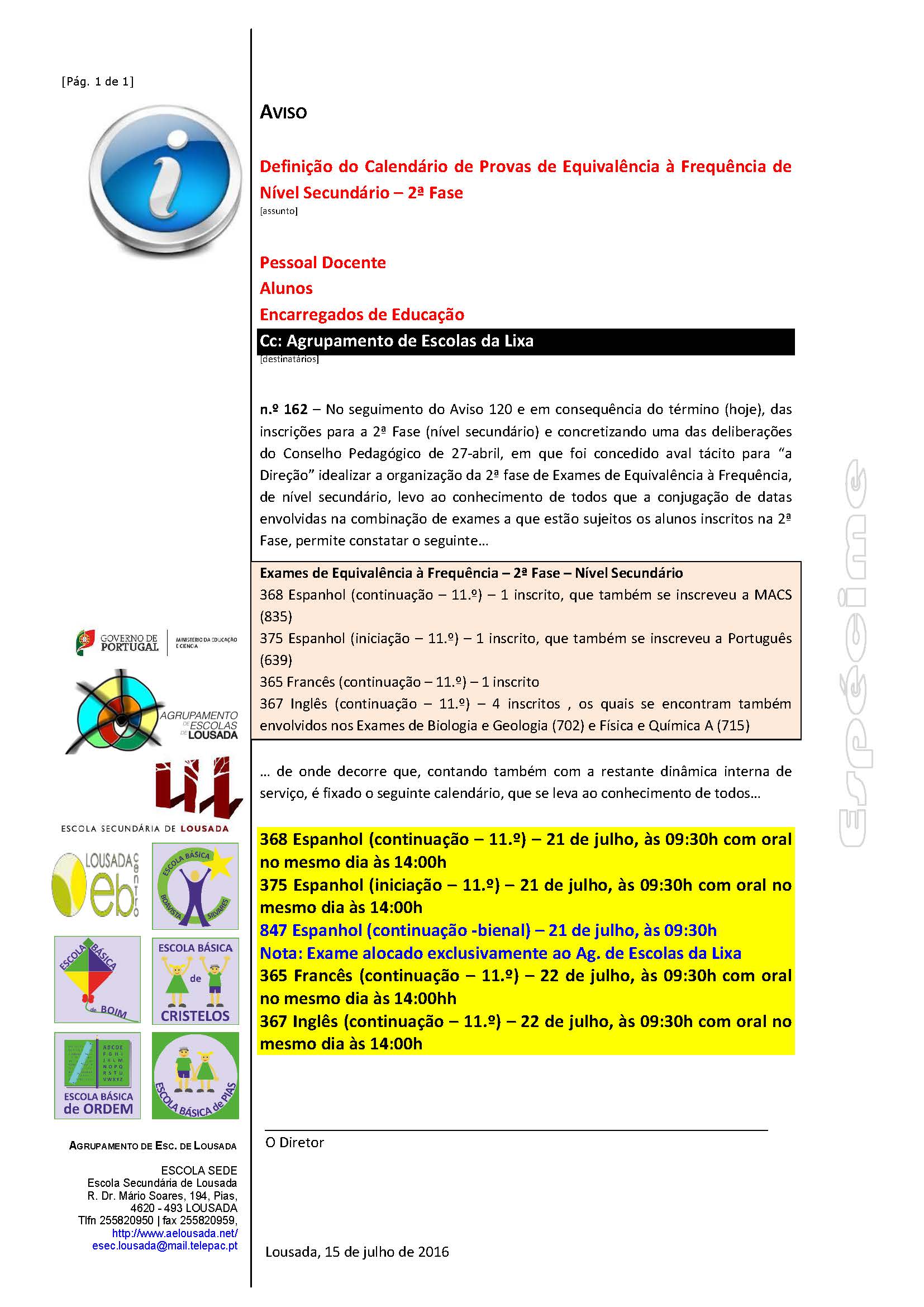 Calendário - Eq. à Frequência - Secundário - 2ª Fase